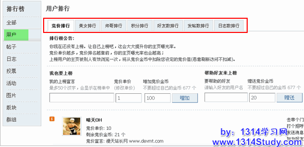 1、增加会员积极性,引导用户消费积分。在排行榜 => 用户排行列表中,分列竞价排行、美女排行、帅哥排行、积分排行、好友数排行、发帖数排行与日志数排行,能调动会员的积极性,引导他们获取积分和主动发帖,争取上榜。