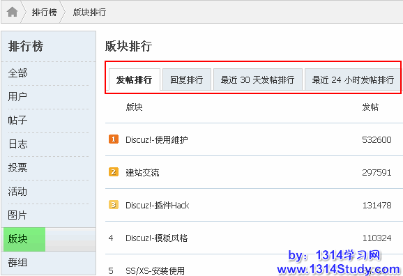 4、版块排行榜展示社区热门版块精华内容,更使站长了解那些版块最受广大用户的欢迎,哪些版块还欠佳,加强精华内容等的运营策略。除了版块排行榜外,还有日志排行、群组排行、活动排行,这些都能展示社区精华内容以及促进用户活跃度。