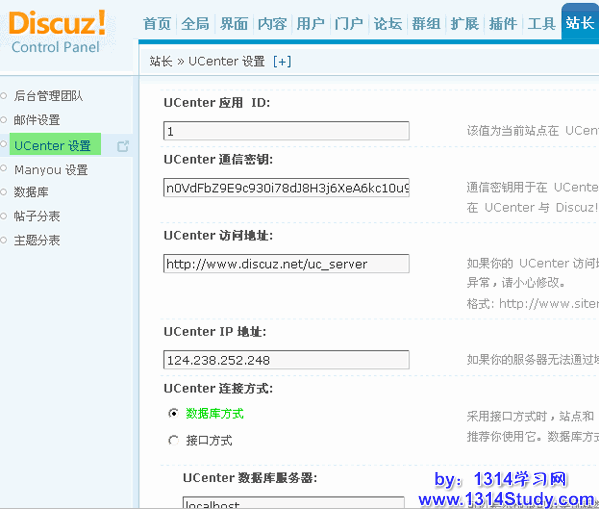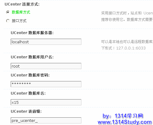 1)数据库方式:需要您站点可以连接 UCenter 数据库,如下图所示: