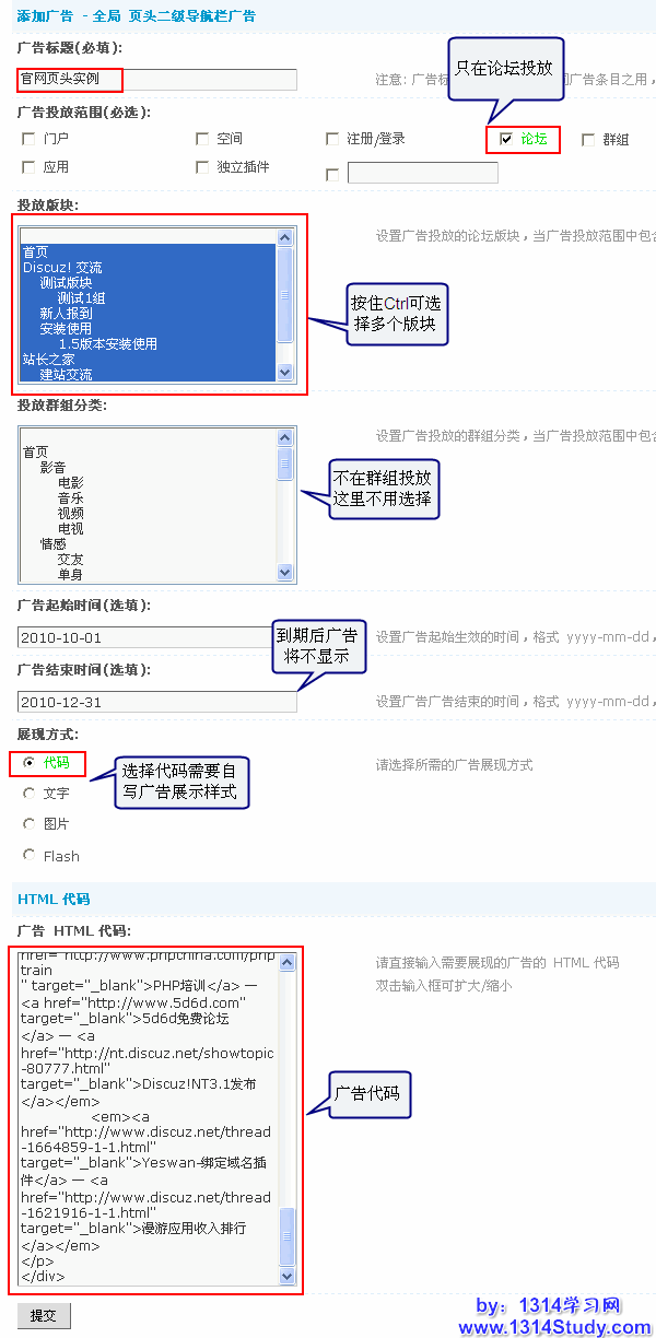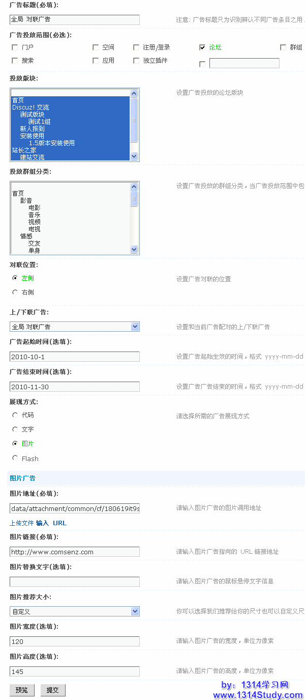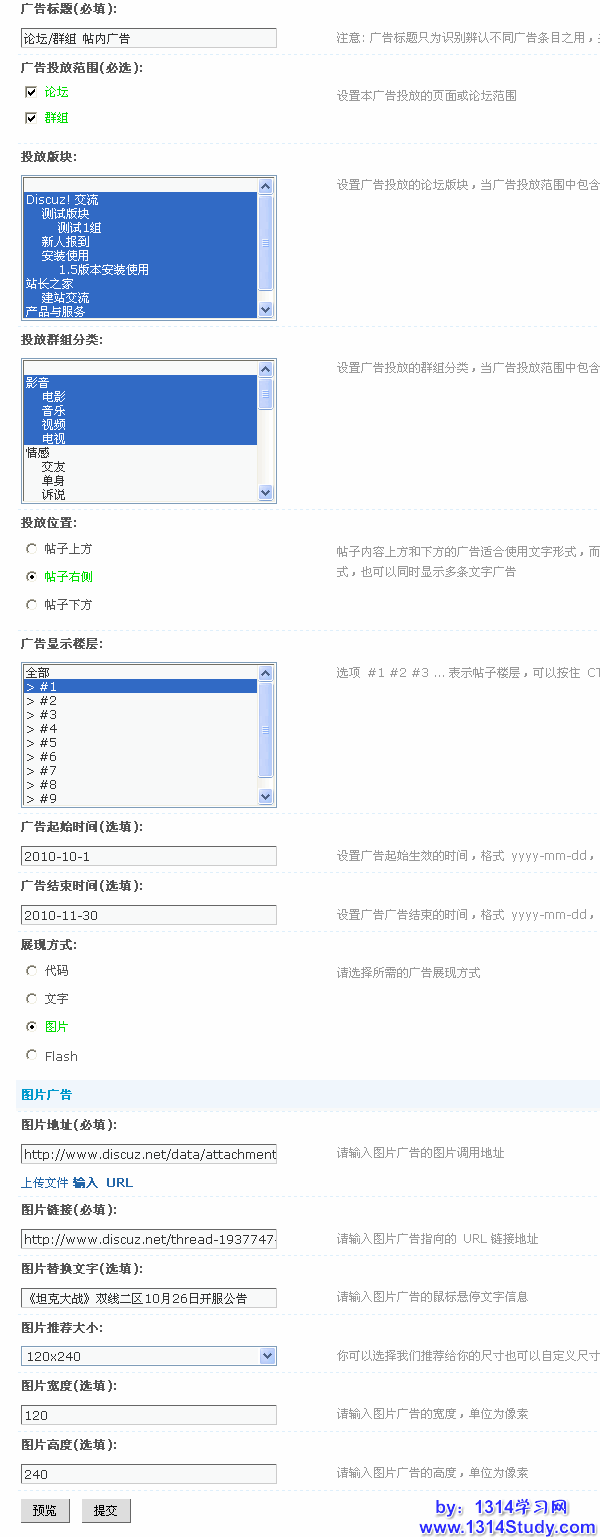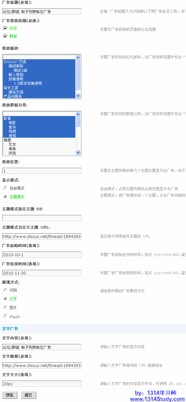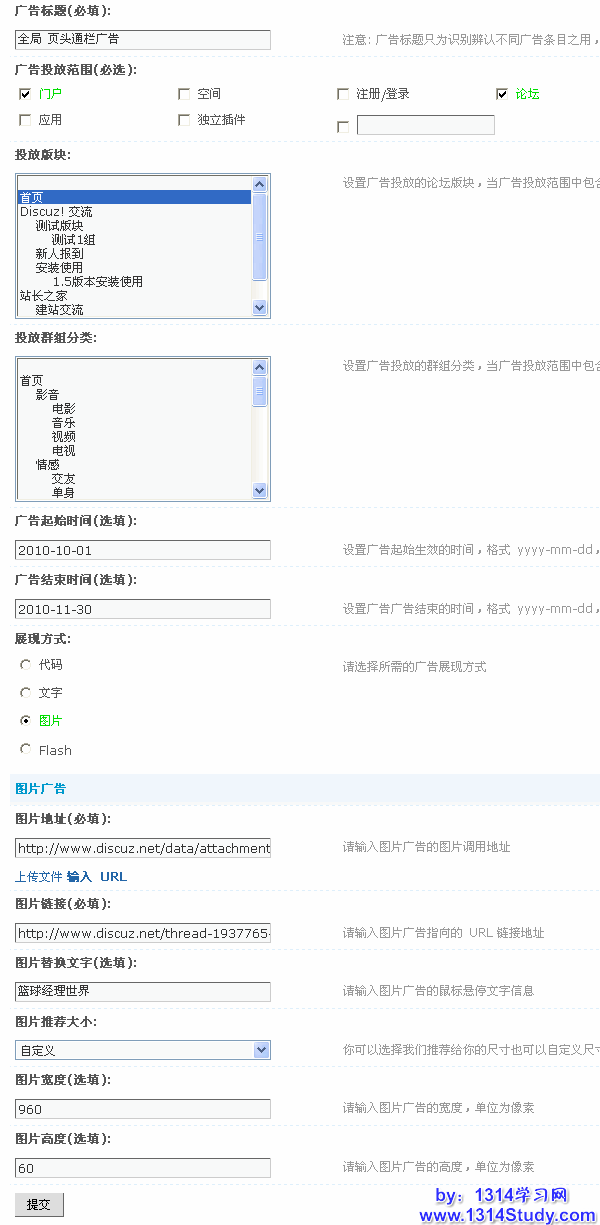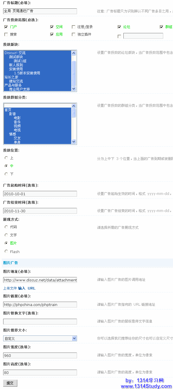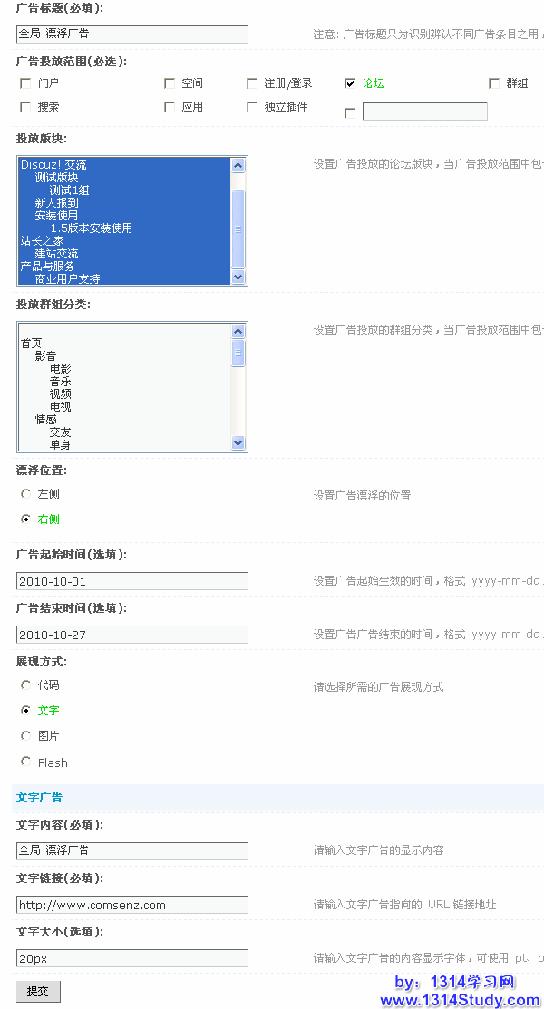 投放群组分类:这里可以不选择,因为前面的广告投放范围只选择了论坛,所在在群组中不会显示,如果上面的广告投放范围选择了群组,这里可以选择群组的分类。