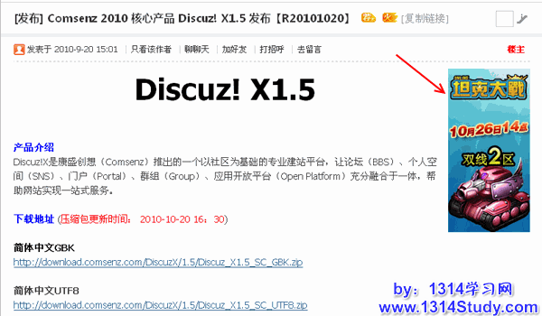展现方式:帖间通栏广告显示于主题帖和第一个回帖之间,可使用 468x60 或其他尺寸图片和 Flash 的形式。