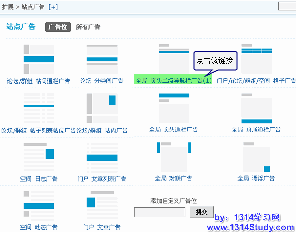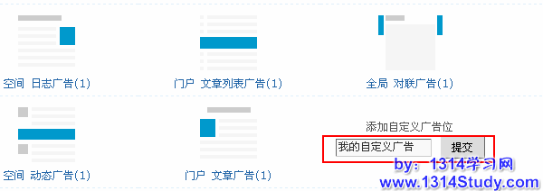 在添加自定义广告位下面的输入框内输入自定义广告的名称点击提交,如下图所示: