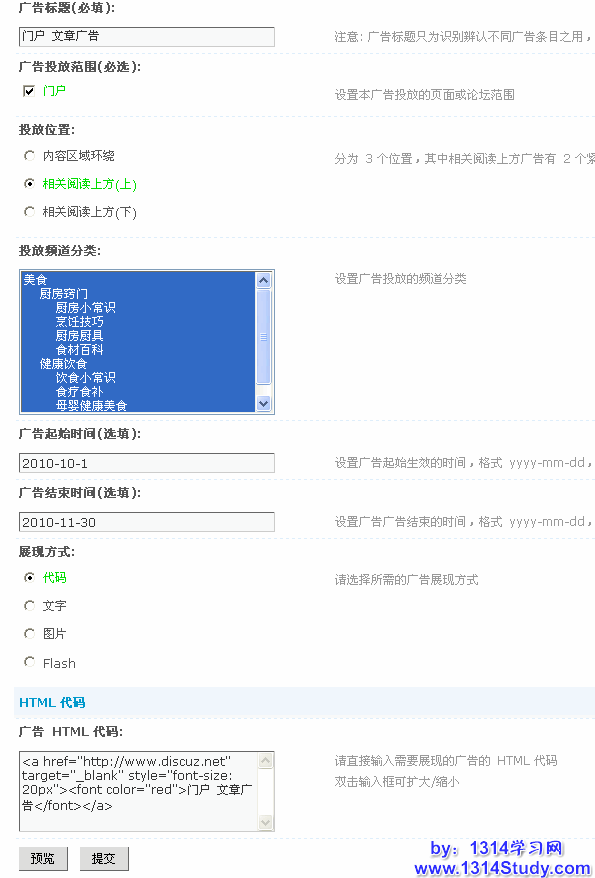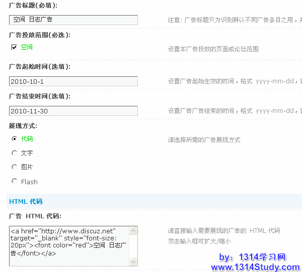 展现方式:为广告主选择好了广告位,接下来就要选择合适的展现方式,以便增加较高点击率从而获得更多收入。Discuz! X1.5为站长提供了代码、文字、图片、Flash等展现方式,站长可结合选择的广告位来设置不同的广告展现方式。不同的展现方式对应不同的相关设置,这里选择代码。