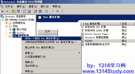 右键单击“Web 服务扩展”,添加PHP扩展支持。