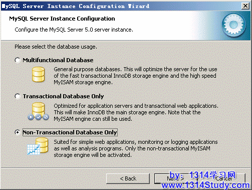 选择MySQL数据库默认存储方式:Non-Trans Only ( MYISAM)