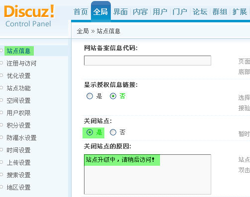 用管理员登录站点后台 => 全局 => 站点信息 => 论坛关闭:选择“是”,如图: