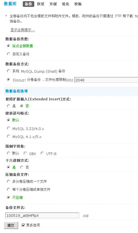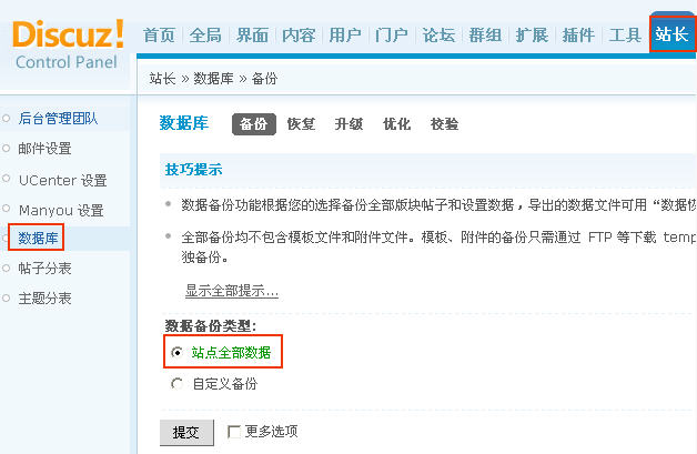 虚拟主机用户推荐直接在站点后台进行备份,用管理员登录 Discuz! X1.5RC 后台 => 站长 => 数据库 => 备份:推荐备份“站点全部数据”,如图: