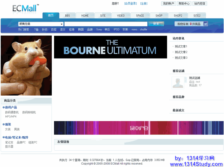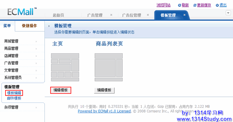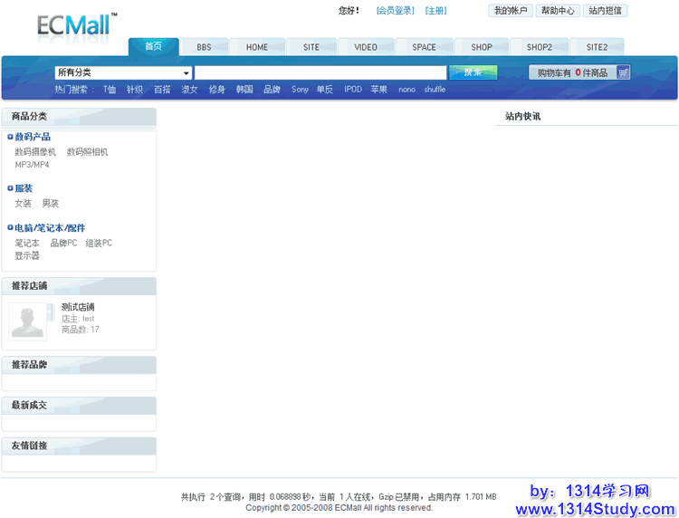 5、回到 ECMall 的后台中,点击页面右上角的更新缓存,便可以在页面中看到本文第二个图的效果了。