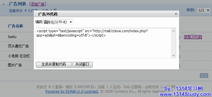 1)如果选择“站外广告”,则您添加的该广告不会在本站的广告位显示,然后在广告列表页面中可以通过“获取JS代码”来得到一段JS的代码,然后这段代码就可以放在任何的地方被引用了。