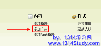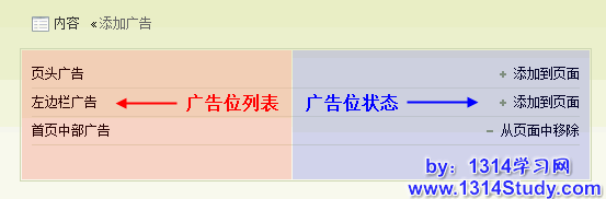 在广告位列表中标明了每一个广告位的当前状态,“添加到页面”表示该广告位还没有加入到页面中,“从页面中移除”表示该广告位已经加入到页面中了。