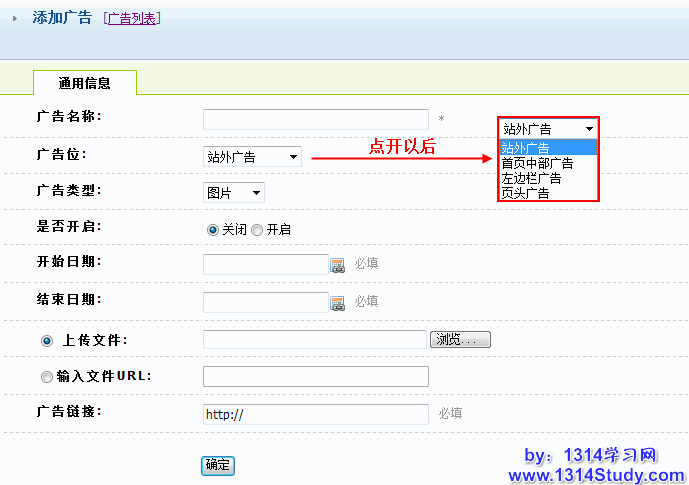 广告类型:可以选择图片、FLASH、代码、文本四种类型,下面的表单也会随类型的不同而有变化。
