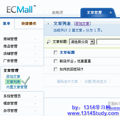 ECMall 后台 => 文章管理 => 文章列表: