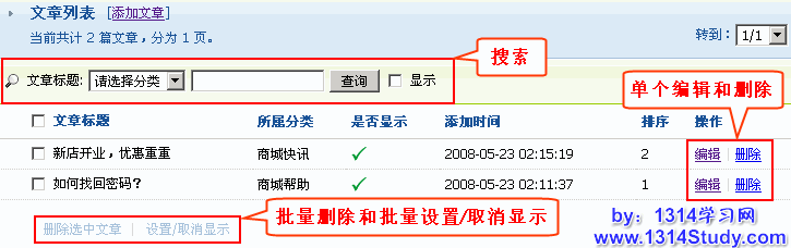 在这里可以对添加后的文章进行搜索、编辑、单个删除/批量删除、批量设置/取消显示等操作。