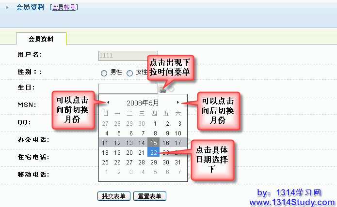 3、生日:默认为0000-00-00,可以手动填写日期,格式为2008-5-23,也可以点击后面的图标选择下日期;