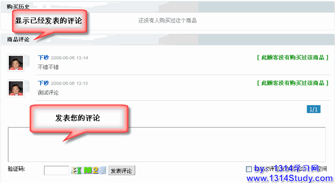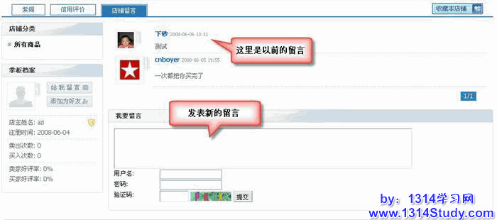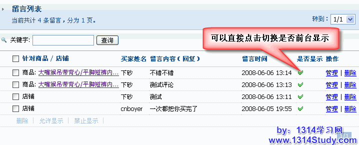 发表的留言和评论,需要店主在后台 -> 店铺管理 -> 留言管理中设置是否显示,前台才可以看到。