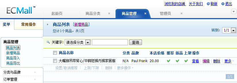 以管理员身份登陆后台,点击左边的“管理我的店铺”,可以进入后台对自己的店铺进行管理。进入后台后,点左边的“商品管理”,在弹出的下拉菜单里选择“商品列表”,就进入商品列表的界面了。如下图: