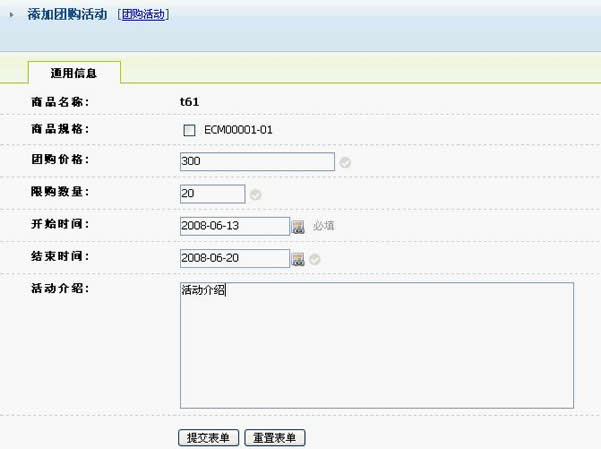点击“团购活动”的链接,可以为该商品进行团购方面的设置,如下图: