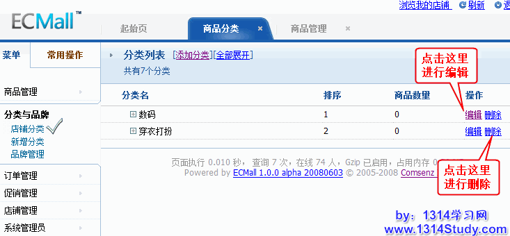 前台“我的帐户” => “管理我的店铺” => 分类与品牌 => 店铺分类