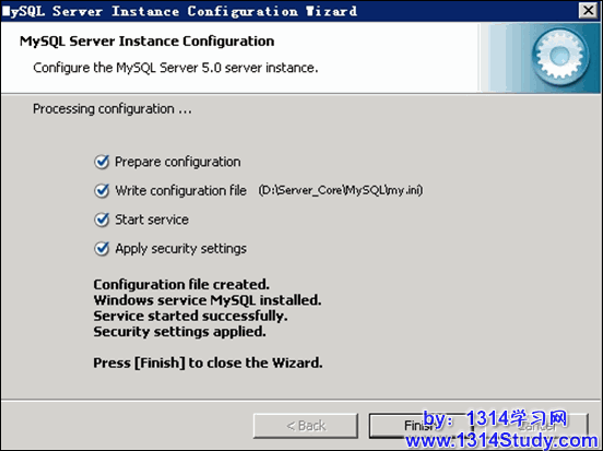 待文件复制安装完毕后,进行 MySQL 设置界面,单击 Finish 。如图 4 所示: