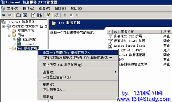 (4) 右键单击"Web 服务扩展",添加 PHP 扩展支持。如图 24 所示: