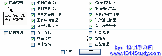 在这里,可以勾选某个项目前的框框,来对此选项中包含的管理权限全选;也可单独勾选每个选项中的单个管理权限;点击下面的“全选”,该管理员将拥有全部管理权限。