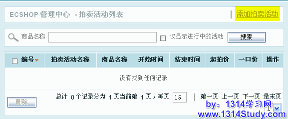 进入后台中心 -> 促销管理 -> 拍卖活动,进入拍卖活动页面见图 1 所示