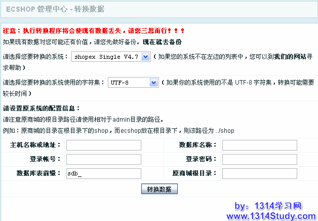 进入 ECShop 后台,在后台中心的左侧菜单栏里找到“数据库管理—数据转换” 进入数据转换的设置页面。见图 1 :