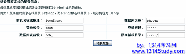 情况 1:原商城的目录在根目录下的 Shopex,而 ECShop 放在根目录下,这里的原商城目录填 “../shopex”