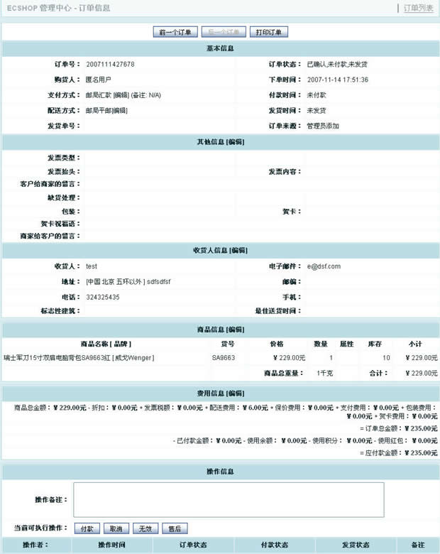 添加订单主要是为了给一些没通过前台流程去买的用户,比如你的一个老用户不能上网,想直接让你给寄些商品,此时添加订单就可以将之前用户该走的流程补足,便于下面的寄送和日后的商品查询。