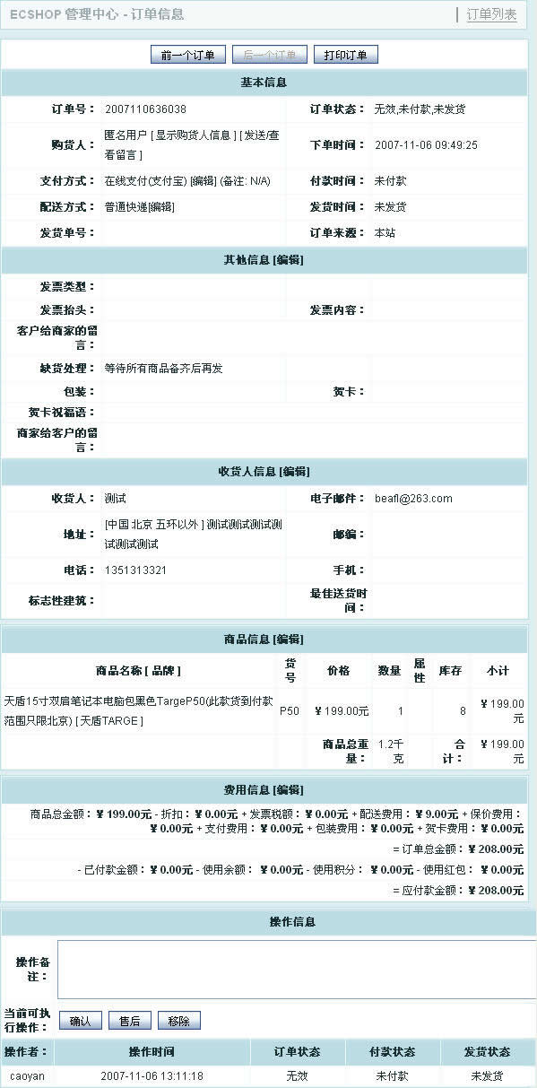 同样如果点击每个栏目上的例如订单号、收款等栏目,会将订单按照点击的栏目顺序或者反序排列。当然对于无效或者是用户取消的订单,管理员可以在订单列表里将其删除。