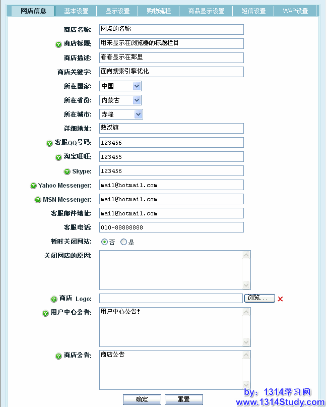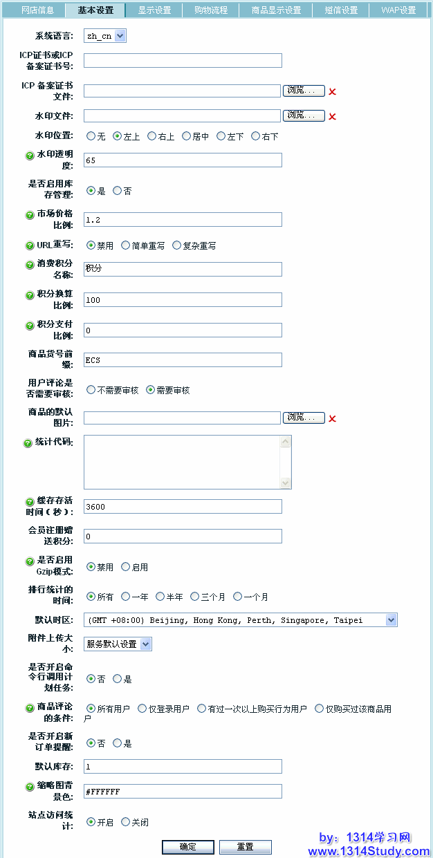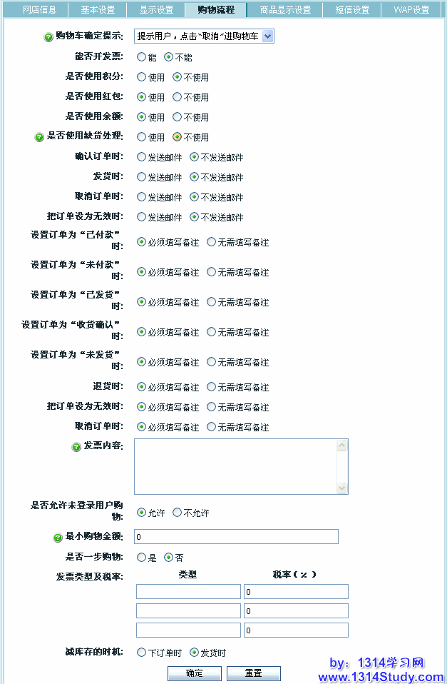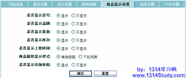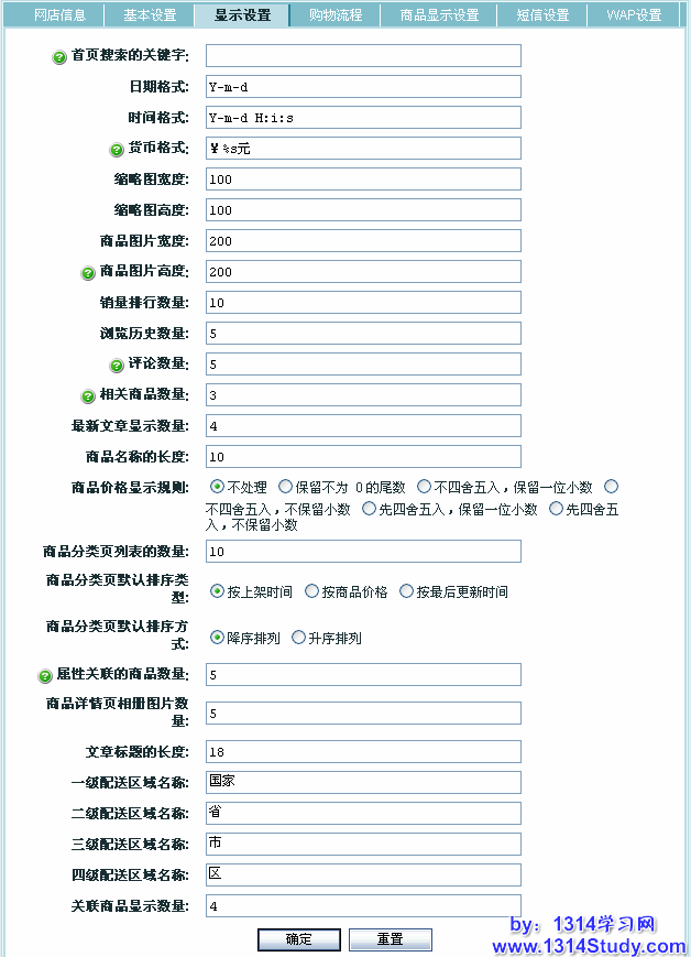 在网店后台 -> 系统设置 -> 商店设置(下图)里,我们可以完成商店的几乎所有的设置,包括的设置有网店信息基本设置、显示设置、购物流程、商品显示设置、短信设置、WAP 设置 等,这个部分可以说是 ECShop 网店系统的核心配置。