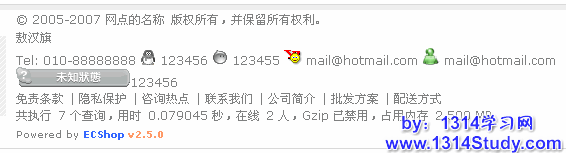商店地址及联系帐号信息:填写后可以显示在前台页面的页脚,如图 3 ,如果您有多个客服的 QQ 号码、淘宝旺旺号码、Skype 号码等等客服帐号,请在每个号码之间使用半角逗号(,)分隔。;