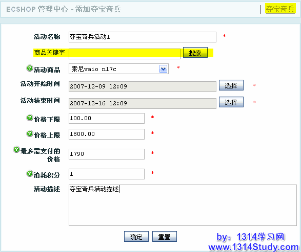 商品关键字:在此栏里输入商品的关键字来搜索出需要参加夺宝奇兵活动的商品,如果不输入任何关键字直接点击搜索按钮的话就会将所有商品都列在 活动商品的下拉框中。