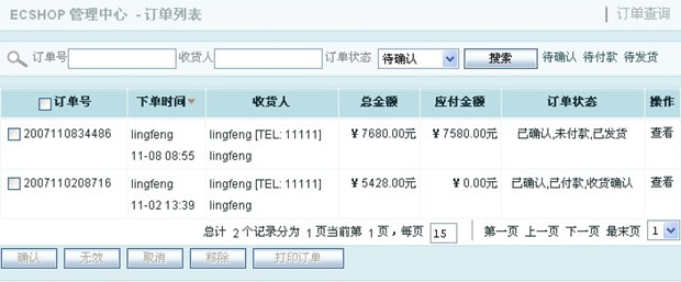在这里还可以根据订单号,收货认,订单状态进行搜索。