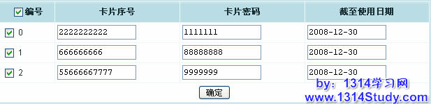 CSV文件第一列为卡片序号;第二列为卡片密码;第三列为使用截至日期。