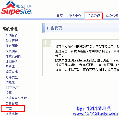 SupeSite 后台 => 系统管理 => 广告,如下图所示: