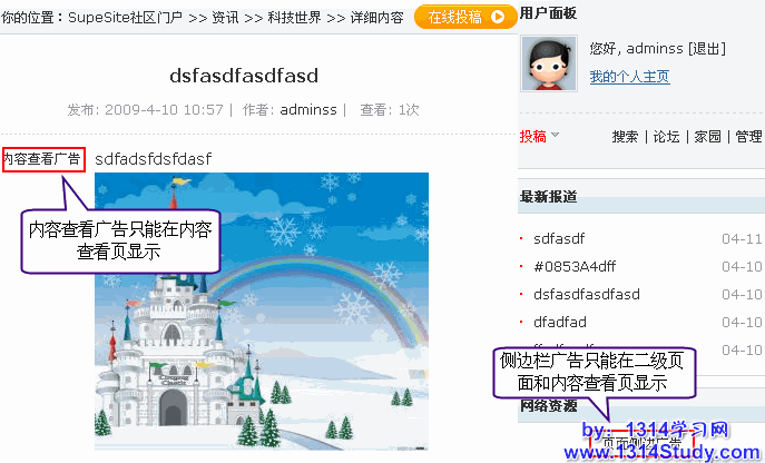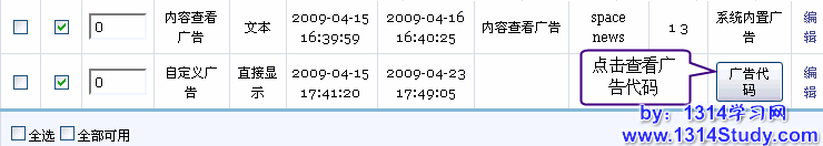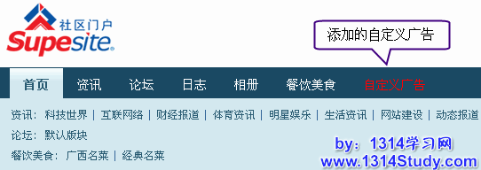 SupeSite 7.0 可以添加的广告大致分为两类:系统广告和自定义广告。