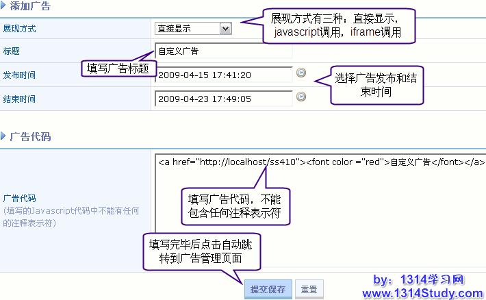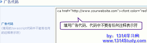 广告代码广告,如果广告类型选择“广告代码”,将看到: