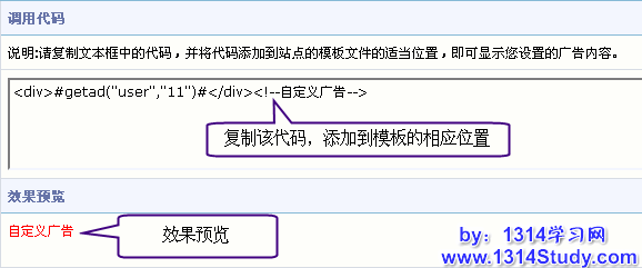 点击“广告代码”,查看生成的代码,然后把这个代码加到您想要显示广告的模板中相应位置,即可在网站显示广告,如下图: