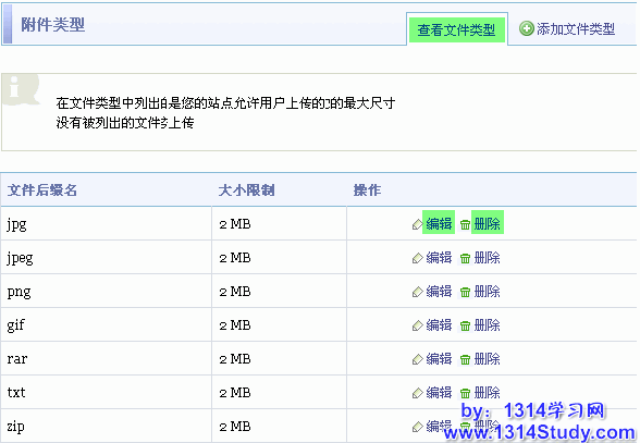 附件类型可以设置您的站点允许用户上传的文件类型和允许上传的最大尺寸,没有被列出的文件类型,将不允许上传,下面讲解下其使用方法,进入系统后台 => 系统管理 => 文附件类型。