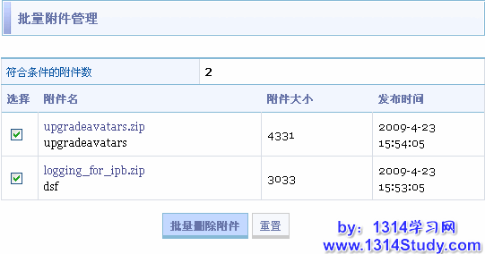 选择您需要操作的附件(复选框打勾),点击“批量删除附件”,进行操作。点击“重置”可以恢复初始的全选状态。