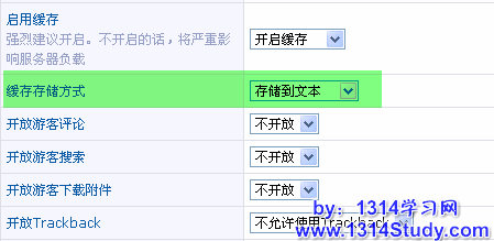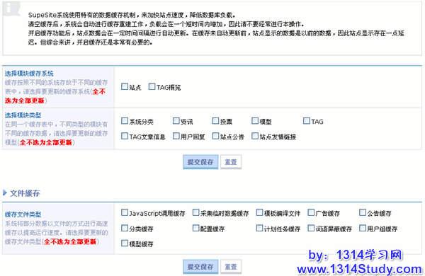 上半部分可以设置数据存储到数据还是存储到文本,设置方法:SupeSite 7.0 后台 => 系统管设置 => 缓存存储方式(如下图)。这个设置只对上图中的“站点”起作用。
