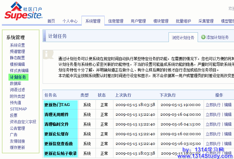计划任务就是,不在人工干预的情况下,定时的去更新一些信息,如“更新热门TAG”等。在安装完 SupeSite 7.0 之后,系统初始化了 6 个计划任务:更新热门TAG、清理无用附件、清理临时文件、更新论坛缓存、更新信息查看数、更新论坛帖子收录。