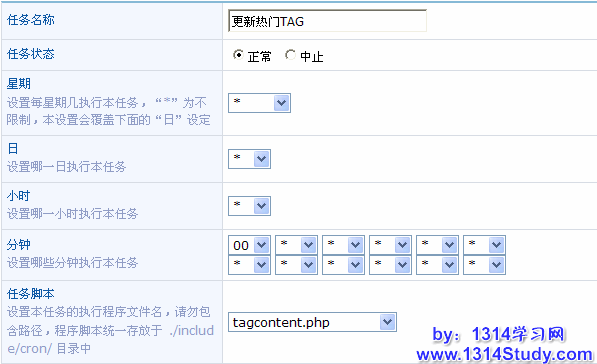 前面两项就不用多说,星期、日、小时、分钟的设置可以联合起来理解,就是当你的系统运行到一个星期的某一天、每月的几号、每天的哪个小时、每个小时的哪一分钟的时候,执行这个计划任务。星号为不受限制,那上面的截图的意思就是每个小时的 0 分钟执行一次。任务脚本表示该计划任务所要执行的操作(在 SupeSite 中,程序脚本统一放在 ./include/cron/ 目录中)。