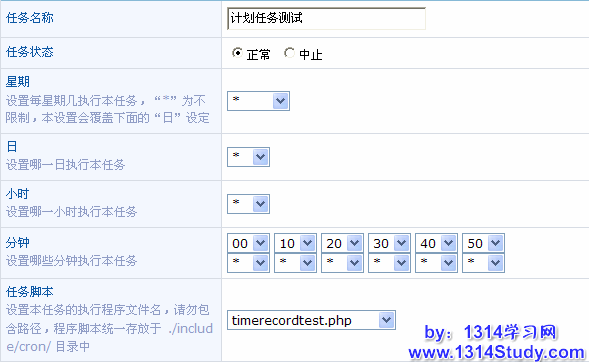 在 SupeSite 正常访问情况下,计划任务的执行时间是每小时的第0分钟后、第10分钟后、第20分钟后、第30分钟后、第40分钟后、第50分钟后。选择执行脚本为 timerecordtest.php 。设置完毕后,点击“提交保存”,然后更新缓存。