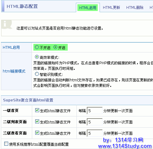 在进入系统后台 => 系统设置 => HTML 静态配置 => HTML 启用中开启和设置 HTML 静态网页后。