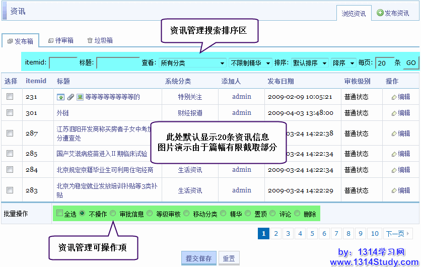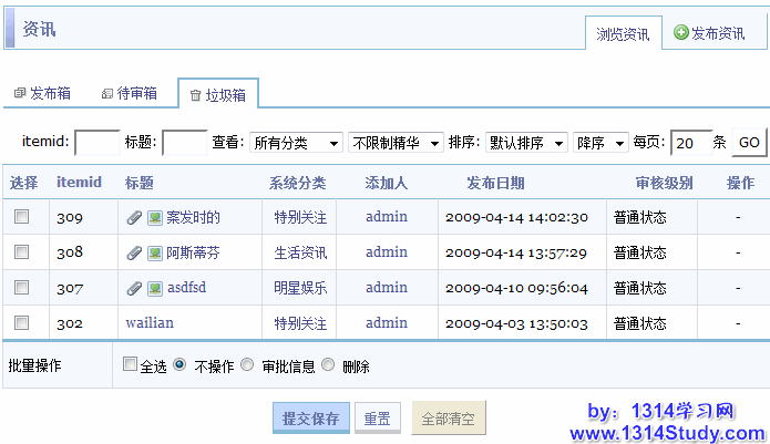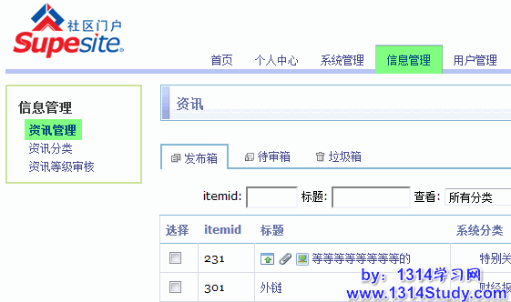 资讯管理是针对站点所有的资讯信息进行搜索、编辑、审核、移动分类、置顶、精华、删除等批量操作。浏览资讯管理包括发布箱、待审箱和垃圾箱的管理,管理者发布资讯的位置也在这里,下面请看详细介绍。