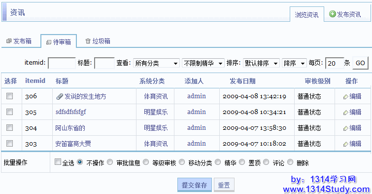 待审箱里可以对资讯进行的批量管理操作也跟发布箱里的操作完全一样,同样不再赘述。