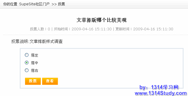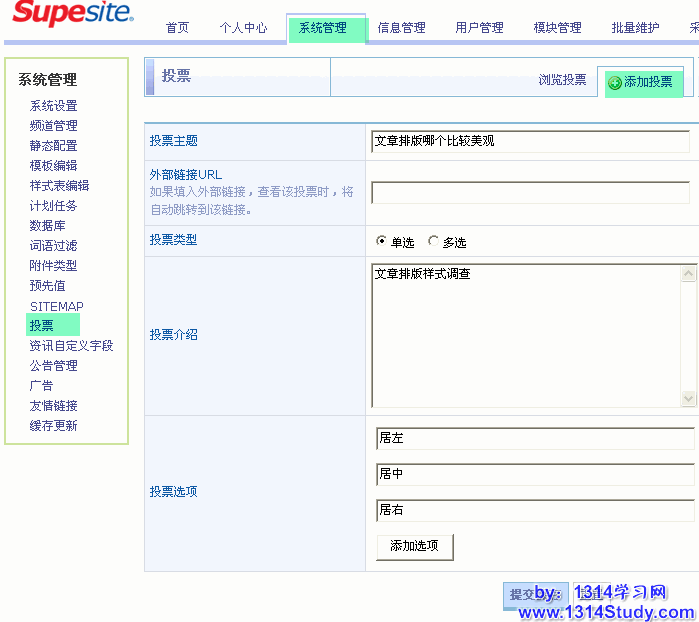 进入 SupeSite 7.0 后台 => 系统管理 => 投票,填写投票的各个选项: