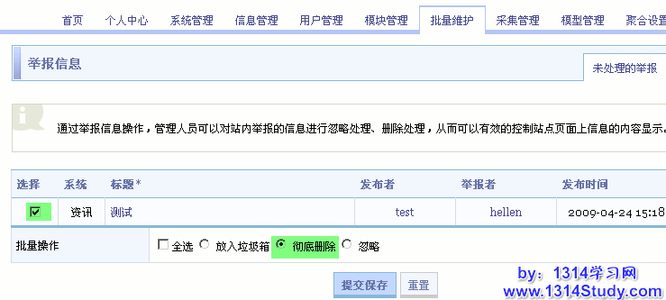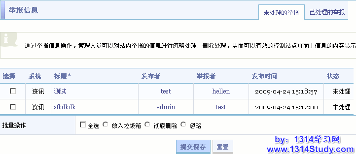 SupeSite 后台 => 批量管理 => 举报信息管理